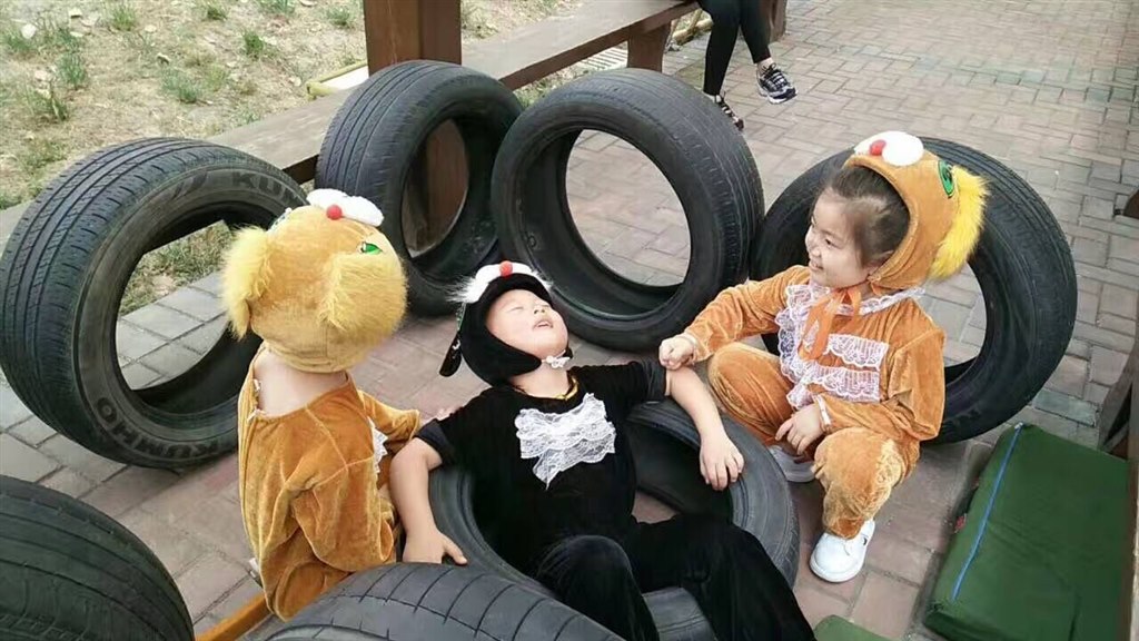 整个户外生态游戏区都变成了他们表演的舞台,山坡用了起来,轮胎用了起来,木板用了起来,就连放在墙边的砖头都被他们利用了起来,变成了孩子们的乐园。