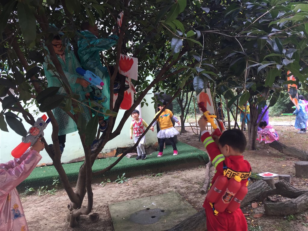 在游戏材料准备之前我进行了谈话活动,逸晗说:我玩的消防车游戏用的小水枪可好玩,可是幼儿园没有着火,我们都是随便乱喷喷的,而且会喷到小朋友。根据孩子提出的问题,孩子们叽叽喳喳提供了许多解决办法,张宏博小朋友说:可以用颜料,画上红颜色,水枪一喷,颜料还会掉下来,这样跟灭火很像。他的好办法得到了大多数孩子的支持,于是一场轰轰烈烈的材料准备活动就开始了,孩子自制了游戏材料,带好了水枪和雨衣,我们班孩子还准备了安全帽,这样就和真正的消防员别无二样。