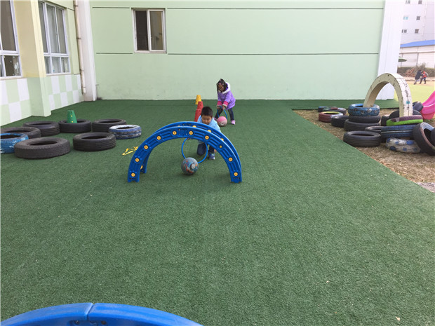 本次游戏的主材料是“球”和“圈”,小朋友拿到这两种材料最直接的反应就是“赶小猪”,这是他们小班时候最喜欢的游戏。那么作为中班幼儿,怎样运用这两种材料有效的开展游戏呢?我们发现教室后面就是绝佳的场地,有山坡、有台阶、有池塘,孩子们可以在这些地方玩“赶小猪”的游戏,不同的地方带给孩子不同的体验,他们选择不同的路线把“小猪”一一送回家。