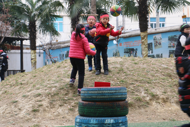 为贯彻落实《3—6岁儿童学习与发展指南》,调动教师创造性地开展幼儿户外游戏活动的积极性,全面提高幼儿园户外游戏的活动质量,促进幼儿身心健康和谐发展,2017年12月27日中二班开展了户外游戏《投掷小勇士》。 活动中教师挖掘球和圈两种器械的价值,鼓励幼儿自主选择,探索器械的多种玩法,使活动器械得以充分利用,使得体育活动更富变化、更具有魅力。