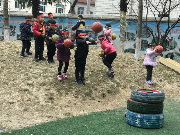 结合中班孩子的实际水平以及《指南》对中班孩子的投掷要求,我把本次活动的重点放在斜坡的投掷上,让幼儿体验从高处向下投掷的技巧,从而调动孩子的主动性、积极性以及增强他们的投掷能力。本次游戏以炸毁敌人的碉堡为游戏背景,分为红绿两队,红绿队寻找各自的目标堡垒进行投掷,红队的队员必须投掷在红色的“碉堡”内、绿队的队员则要投掷在绿色的“碉堡”内。在游戏中孩子们遵守游戏规则去“弹药库”时每次拿一个球作为炮弹,有很多孩子都将炮弹投进了堡垒中,及时没投中的孩子也依然一次次的再次投掷,整个活动孩子们都热情高涨。