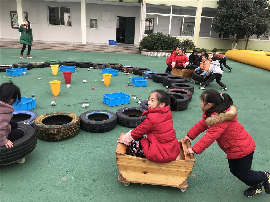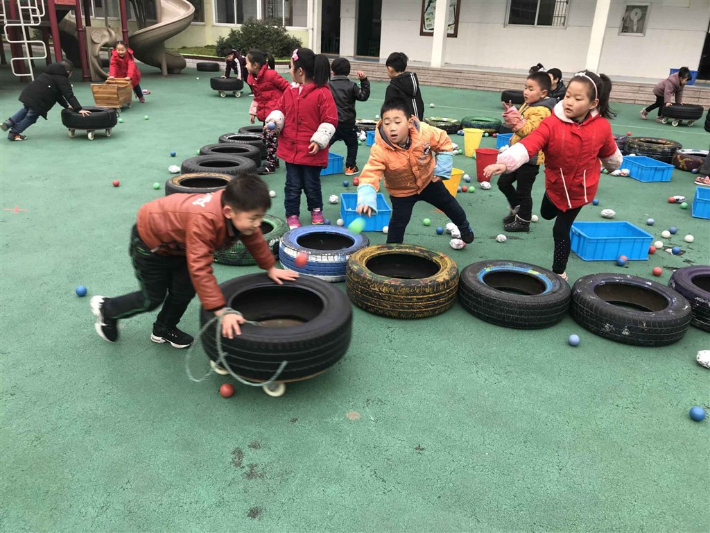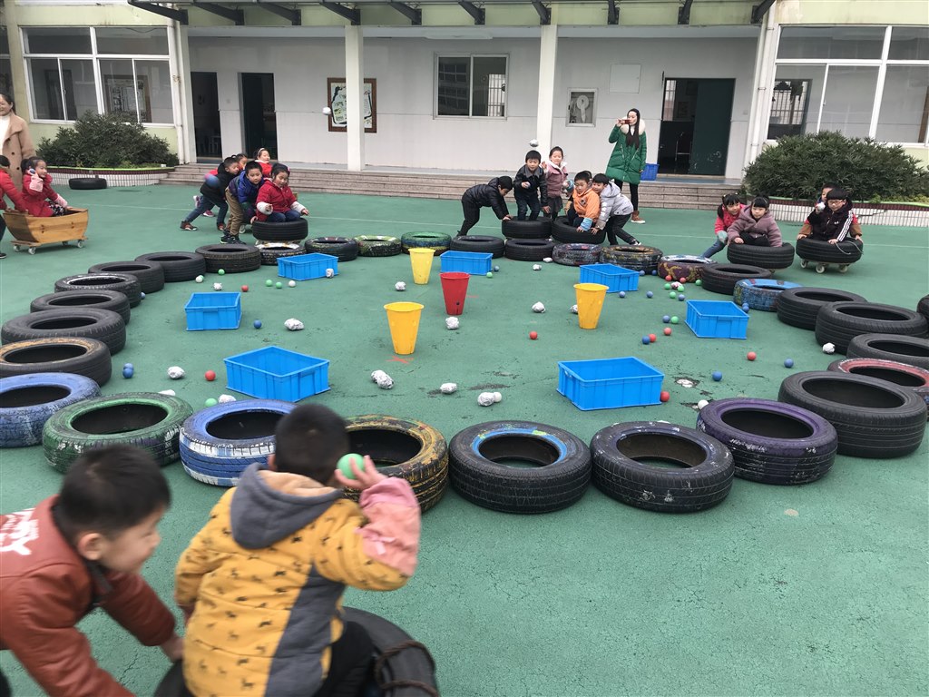 在游戏中,孩子们根据自己的意愿自主的选择角色,两两合作,一个是推轮胎车的人,一个是投手,投手们在轮胎车上瞄准场地中间的靶子,有的选择了稍微容易的外圈的蓝色塑料筐,有的则是选择瞄准在内圈,圈口小的不容易投中的障碍桶,有好多孩子投中了发出了开心的笑声。一段时间后也自主的交换,让每个孩子都能当投手享受投掷的乐趣。当然游戏还没有结束,还有更高难度的,投手们走到轮胎拼出的圆里面,而靶子呢变成了一个个轮胎车,从固定的靶子到移动的靶子,孩子们的兴趣更加浓厚,投手们要找准时间,投中靶子,推轮胎车的幼儿呢,也要全速奔跑,不让投手们投中,孩子们都玩的很是开心。