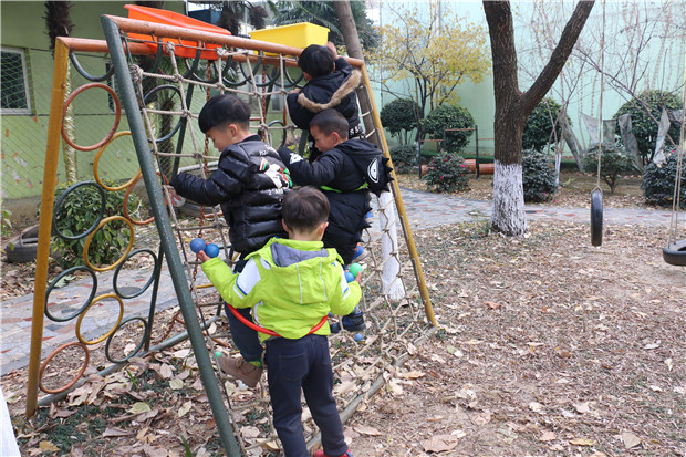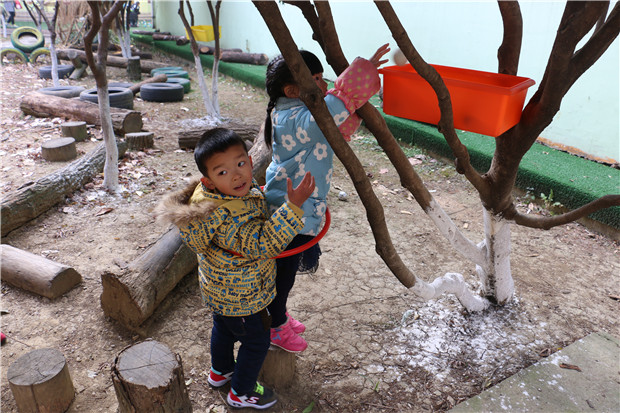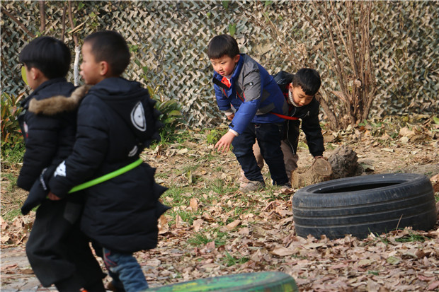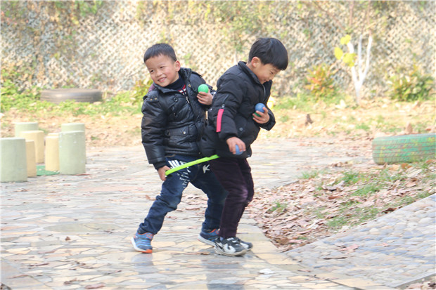 游戏中,幼儿两两为一组套在一个呼啦圈中,共同前进完成运粮任务。这对于中班幼儿来说具有一定的难度。游戏刚开始时,不少幼儿不停地摔跤,但大家不放弃,经过多次尝试,基本所有的幼儿都能顺利前进。有些幼儿找到了将脚分开两边走的方法;有些幼儿不停和同伴商量前进方向;有些幼儿互相搀扶。游戏中,有的“粮仓”设置在小坡顶端的平地上,有的在树杈上,有的在攀爬架上,有的在小沟对面。有些幼儿一人负责放粮、一人负责传递;有些幼儿共同攀爬……每个人都在为自己队伍的最终胜利努力着。