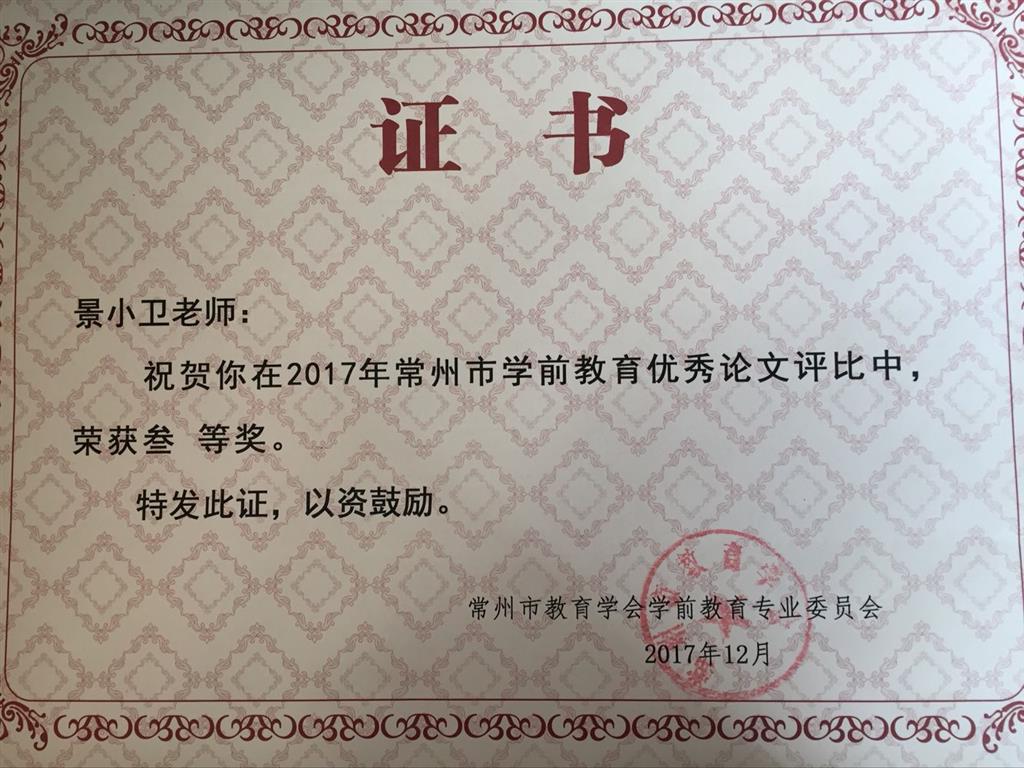 景小卫老师撰写的论文《基于生态理念下开展幼儿表演游戏的思考与实践》获常州市学前教育优秀论文评比三等奖(2017年12月)