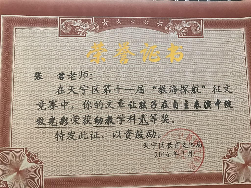 张君老师的论文《让孩子在自主表演中绽放光彩》区教海探航二等奖(2016.7)
