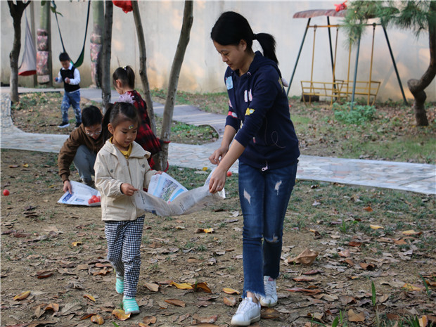 今天,幼儿园的12位老师当起了12个孩子的爸爸妈妈,一起来实践了《报纸运球》这个游戏,所有成员自由结对,分为红黄绿3组。我们在拓展园的各个角落(高空低空)安放好若干海洋球,幼儿和家长拉着报纸的四角去拓展园找与之间队伍相应颜色的海洋球,将球放在报纸上(报纸上球的数量随意),运到各自队伍的框框里,在规定时间内比赛哪组的球多则为胜。