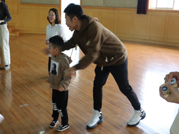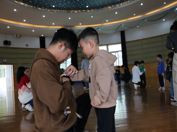 游戏分为两个层次。第一层次,家长为主,因为小班的孩子不分理解能力不足,有时候游戏的要求并不能完全理解,所以在第一个环节,我们的家长朋友先示范游戏,除了引导他们游戏的内容以外,重在激发他们参与游戏的兴趣,在规定的场地内,家长互相追逐,争夺他人身上的“羊毛”,多的为胜;第二层次中,以幼儿为主,孩子们互相追逐,抢夺他人身上的“羊毛”,并将胜利的果实交给自己的爸爸妈妈,因为幼儿的精细动作发展不是很完善,最后由家长将战果呈现在幼儿的身上。