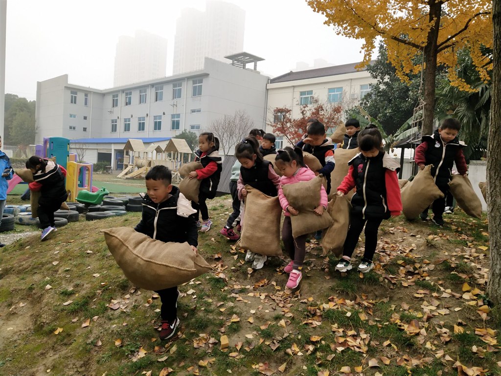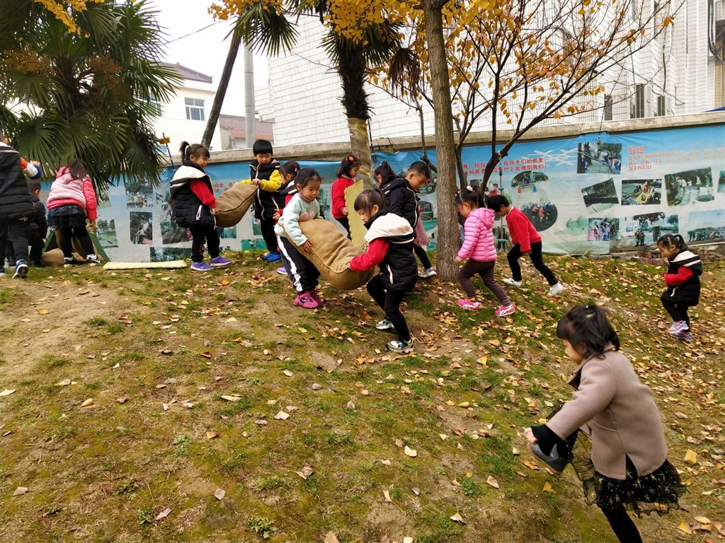 活动中,以帮兔奶奶搬家为游戏情景,孩子们开始了从山上搬运东西下来的活动,沙袋和彩色泡沫垫的体积较小,幼儿能独自一人完成搬运活动,对于体积较大的蓝色泡沫垫幼儿能够自发的几人合作游戏进行搬运活动,活动中幼儿的上肢力量得到了很大的发展。