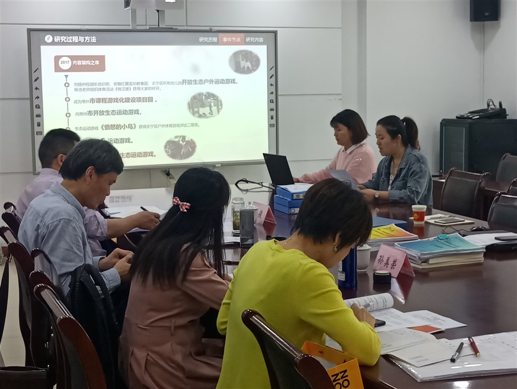 《幼儿生态运动游戏的实践研究》课题,于2016年3月起开始前期研究,在2016年9月参加了常州市“十三五”课题的开题论证,成为市级备案课题。2017年11月进行了中期评估,2018年2月被确立为常州市教育科学“十三五”规划重点课题,研究历时3年。主持人邵丽娟老师结合丰富的PPT详细地从四个方面做了汇报,分别是课题研究基本情况、研究过程与方法、收获与成果、问题与展望。接着,课题专家查阅课题资料,论文集;问卷的调查研究数据报告;教师们在研究过程中撰写的各类案例集等。