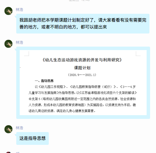 会议由课题组长林浩来主持,主要内容围绕本学期的课题开展工作计划进行查漏补缺和在线答疑。研讨的内容版块分为指导思想,本学期目标,主要工作及措施,每月工作安排四块。课题组的组员们在线积极发言,各抒己见,提出了自己对计划制定的意见和建议,并在线展开了激烈的讨论。在大方向明确的前提下,组员具体对每月工作安排提出了合理化建议。由于课题开展时间比较短,大家的研究还不够深入,组员建议在厘清相关概念的前提下再进行游戏活动的开展。在大家研讨后决定,游戏活动开展是有必要性的,但是可以有针对性的开展,比如,优先考虑中大班,小班的幼儿因为刚入园,可以再缓一缓,重点以观察为主。