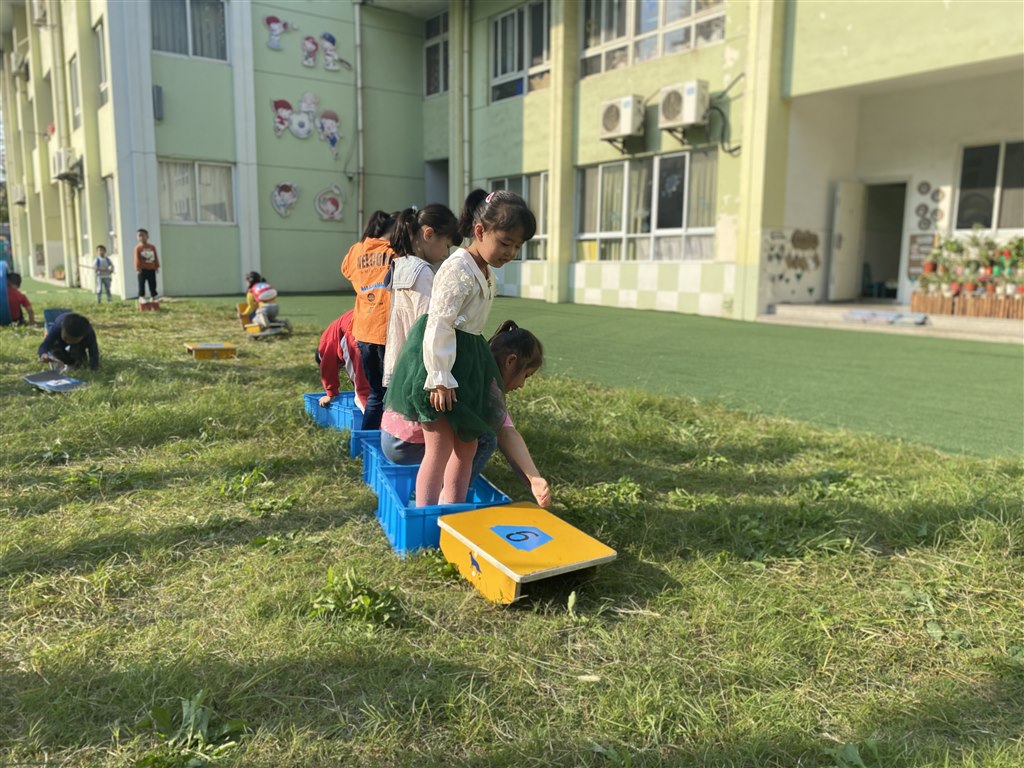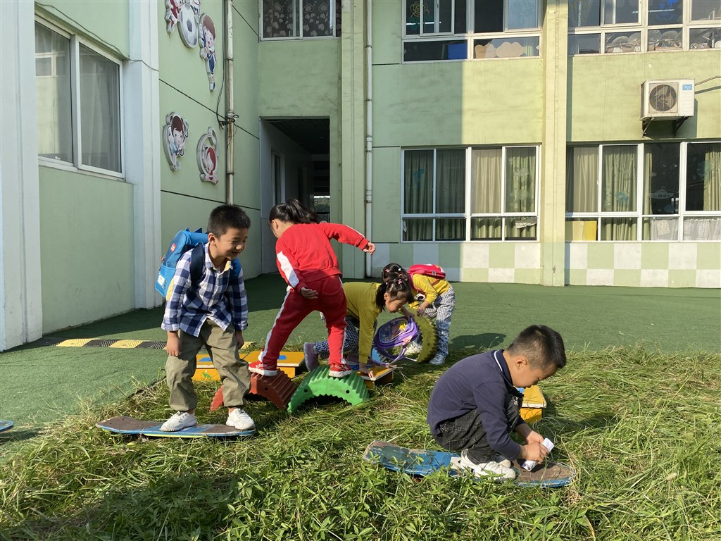 大三班的王宇俊老师利用草地和孩子们玩起了“探宝”的游戏,孩子们先找到宝藏图的碎片并拼完整,然后根据提示去找“沼泽”(草地)里藏着的宝藏,过程中脚不能碰到“沼泽”,要选择合适的材料行动。
