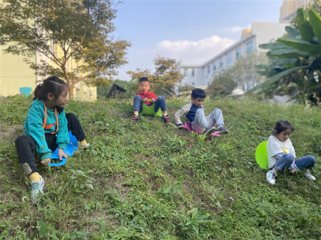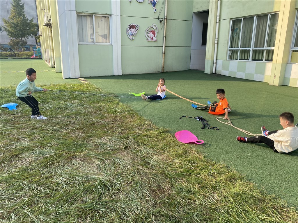 大二班的王珍芳和刘琳老师则利用孩子们最喜欢的滑草板,在草地上玩起了“滑草”游戏,孩子们有的独自滑、有的两两合作,有的则几个人拉一个小朋友……最刺激的是,孩子们还来到了小山坡,从山坡上滑下来,真正感受到了滑草的“速度”与“激情”。