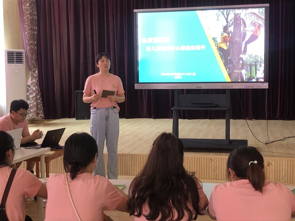 我园作为一所运动特色园,有着丰富的场地资源、材料资源等,幼儿在户外进行运动游戏时,又有足够的自由、自主选择游戏内容及材料、同伴的权利,幼儿的运动能力提升较快。幼儿园目前在研课题围绕资源开展。现场教研之后,雕幼市级课题主持人胡一茹老师,交流分享了“基于生态运动游戏中的资源建设”,阐述了课题组的研究内容。胡老师从“对幼儿、教师、家长进行资源调查的结果分析”、“ 基于园内资源、社区资源和周边资源的不同策略性研讨”、“生态运动游戏资源利用的案例性开发研究(冬奥专题游戏研究、疫情居家运动游戏研究)”、“园所运动游戏资源库的研究”逐一开展交流。整个交流分享内容详实有料,真正体现出雕幼教师科研能力的实效性与研究性。