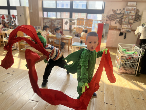 区域活动开始了,韵韵、子瑜、淦淦拿着自己的进区牌在教室的各区域之间游走,淦淦来到了表演区,拿起“龙”的尾巴和头套开始给自己装扮,芯瑜和韵韵来到了语言区开始看书,说悄悄话。韵韵嘴巴贴着芯瑜的耳朵,没一会儿,两人就笑了起来。随着她们的视线看过去,发现淦淦一个人在教室前面的空地上打滚,“嘶吼”。