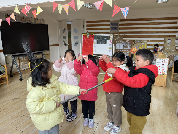 吴静走到表演区素材筐那里,拉开抽屉找了找,拿出一条毛领,说“我们把这个毛毛系在棒子上面。”