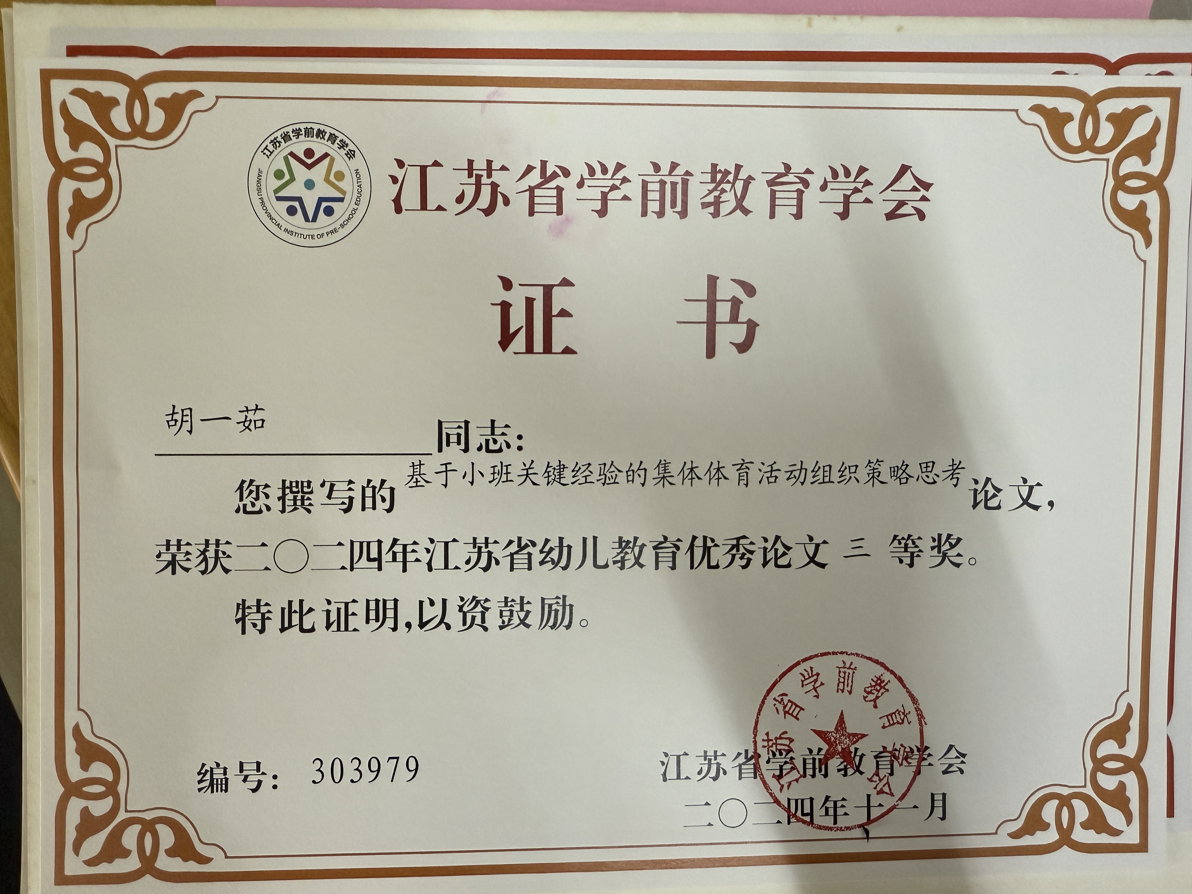胡一茹论文《基于小班关键经验的集体体育活动组织策略思考》获2024.12江苏省论文评比三等奖