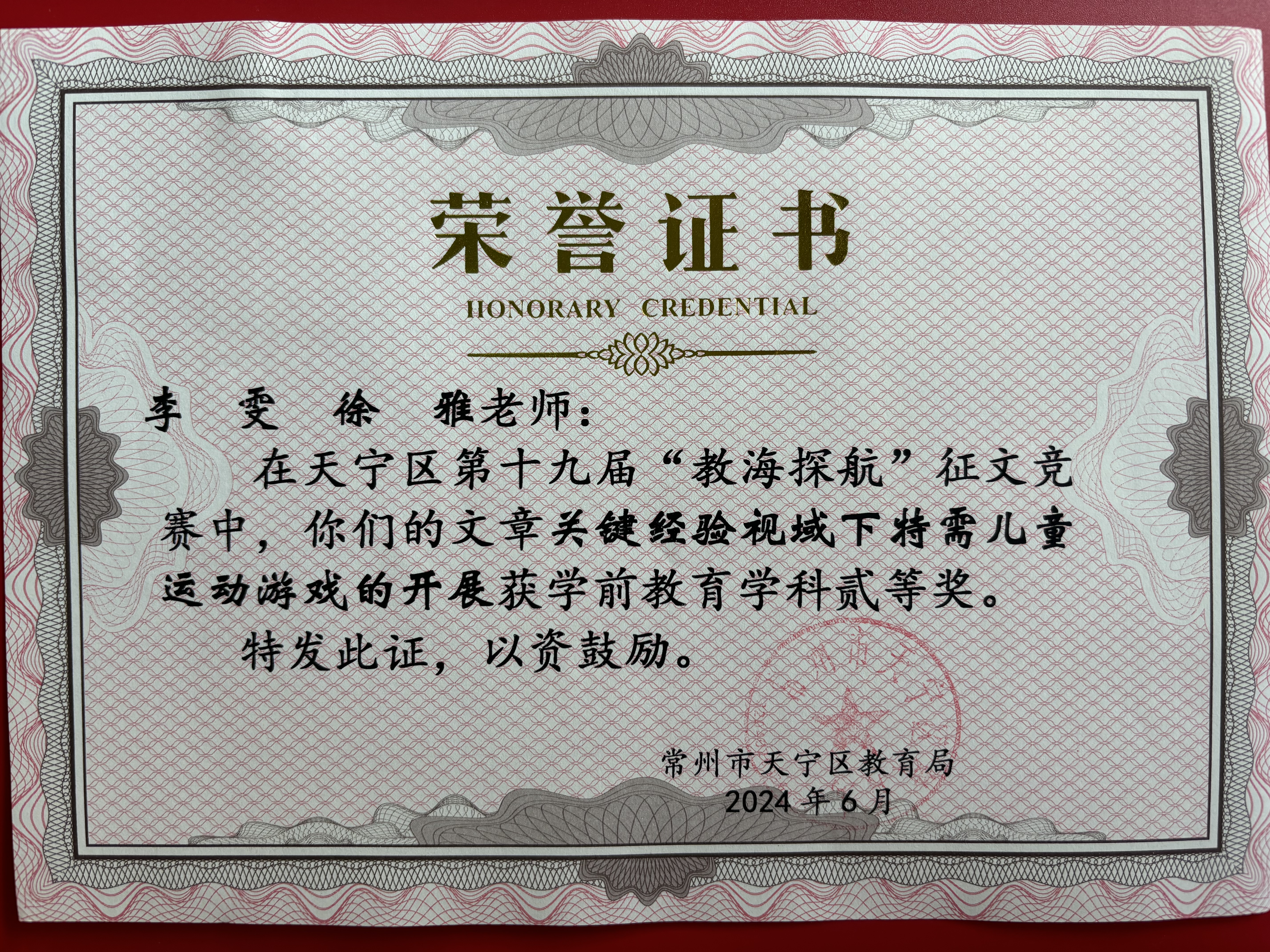 李雯、徐雅论文《关键经验视域下特需儿童运动游戏的开展》获2024年天宁区教海探航二等奖