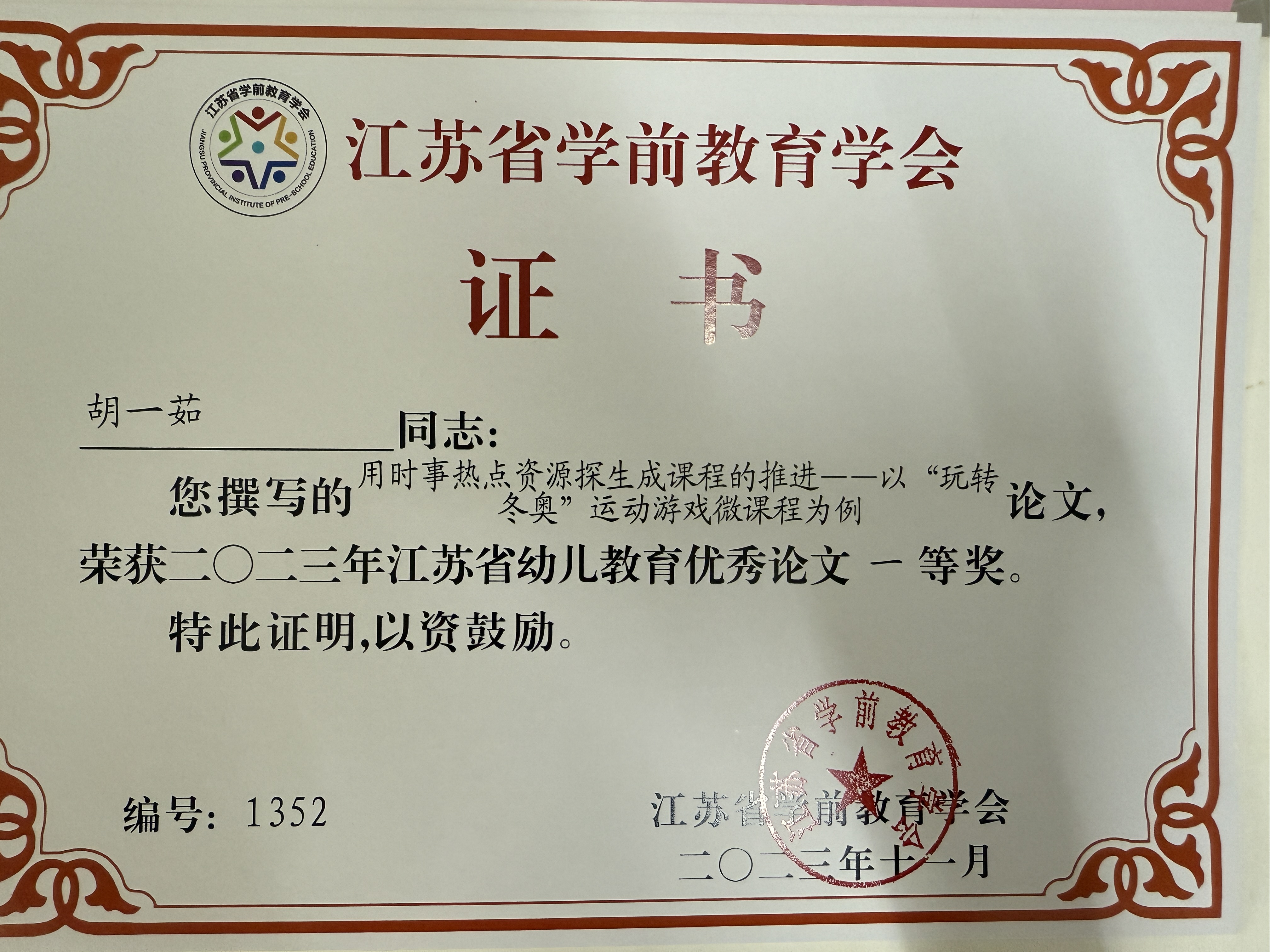 胡一茹论文《用时事热点资源探生成课程的推进》获2023.12年江苏省论文评比一等奖